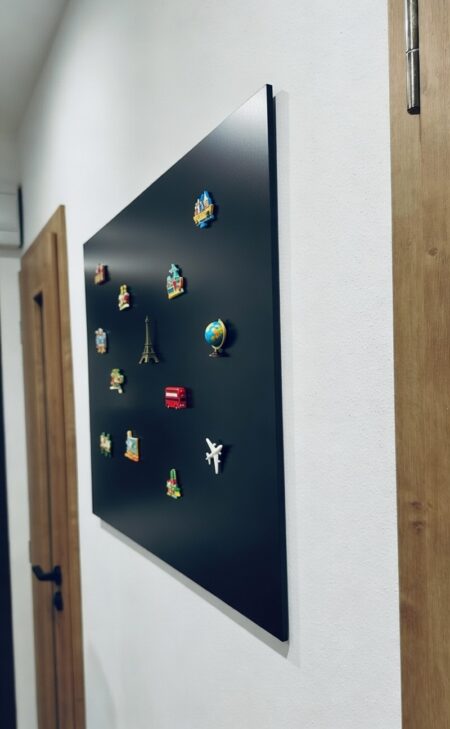 Štýlová a praktická bezrámová čierna tabuľa je ideálnym miestom na vystavenie vašej zbierky magnetiek. Tabuľa je vyrobená z kvalitného materiálu (kovu), ktorý umožňuje uchytiť všetky druhy magnetov – od cestovateľských suvenírov až po dekoratívne kúsky. Jednoduchý bezrámový dizajn sa hodí do každého interiéru, či už ju umiestnite v obývačke, kancelárii alebo detskej izbe. Skvelý spôsob, ako si uchovať spomienky a zároveň štýlovo ozdobiť váš priestor.